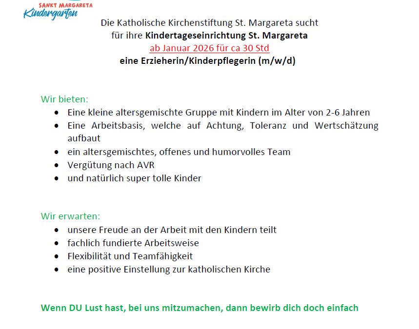 Kinderpflegerin/Erzieherin (m/w/d) gesucht in St. Margareta Kemnath a. B.