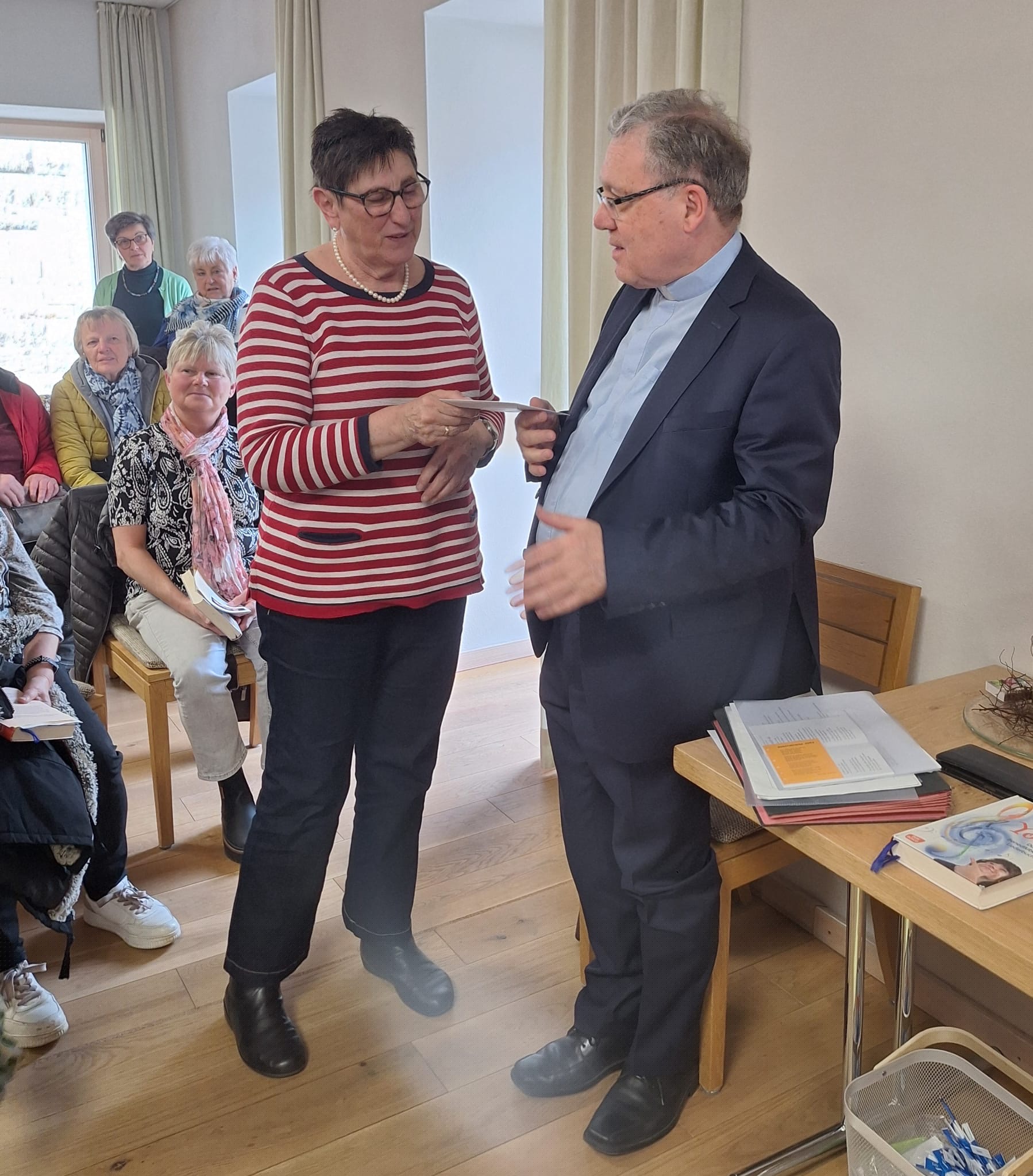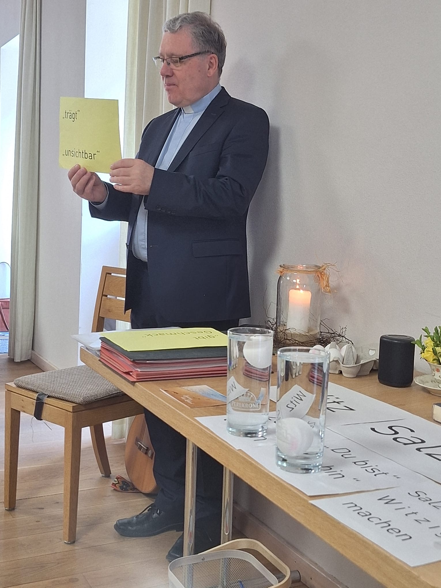 Der Tag stand unter dem Thema: Womit wieder „witzig” machen? Bezogen auf eine Übersetzung von Friedolin Stier: „Wenn das Salz seinen Witz verliert …”. Zu Beginn erhielt jede Teilnehmerin ein kleines Tütchen Salz und den Text: „Ihr seid das Salz der Erde”. Im übertragenen Sinn kann Witz auch Sinn bedeuten. Anhand eines Experiments wurde den Damen verdeutlicht, dass das Salz trägt. Wir können tragen und ertragen. Salz ist im Wasser unsichtbar. Auch Gott ist für uns Salz. Der ungewohnte Ausdruck lädt dazu ein, neu über die eigene Glaubenskraft und Ausstrahlung nachzudenken: Was gibt dem Glauben Würze? Wie kann er im Alltag wieder lebendig und kraftvoll werden? Also heißt es, nicht nur auf sich selbst schauen, sondern beschäftigen wir uns mit unseren Mitmenschen und gehen auf ihre Bedürfnisse ein! Sind wir selbst bereit, Altes loslassen zu können und für neue Erfahrungen im Leben offen zu sein, dann bleibt unser Leben würzig, witzig und voller Salz!